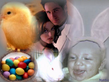 Title: The Bunny's Ears Thanks: As always, to my beta-readers extraordinaire, Nancy and Traci Note: Daly's Farm is a fictitious place St. John's Church Scully kissed William's palm as he brought his hand to her mouth once more. A new favorite game, it garnered instant baby giggles, and in turn, a broad smile from her. Not to mention smiles from many of the elderly parishioners passing by the pew she and William sat upon with her mother and her nephew, Matthew. The throng of church-goers exiting the church now that the Mass was over was a steady stream. Apparently finished getting Matthew into his coat and hat, her mother remarked, "Are you two all set?" Scully turned her head to the left to reply, getting wet baby fingers in her ear for her trouble, and saw that her nephew was indeed dressed in his outdoor apparel. "We will be in just a minute," she said, and then added in explanation, "I thought we should wait until some of the crowds diminished. It will be easier with these two little guys." "That's true," her mother agreed, and asked Matthew to sit down again, which he did without complaint. "I'm not little!" he did protest though, once seated, his eyebrows mulishly set and his lower lip jutting. The expression on his face brought up vague memories of his father Bill as a child. "I'm a big boy, mommy said!" Bill and Tara were taking a much needed vacation alone over the Easter holidays, and her mother was watching Matthew for them. "You're right," Scully agreed, trying not to smile at his perturbed declaration. "You are a big boy, Matthew. But William isn't yet, and since he's just learned how to walk, I want to wait a little while before we go, okay?" "Okay, Auntie Dana." His tiny loafer-clad feet began to kick slightly, thunking against the wood. Shifting William to her other arm, Scully sat him down on the pew beside his cousin, and turned sideways, facing him, to get his coat on. Her son had moments of willfulness, where he cheerfully went out of his way to make the most ordinary task a major event. Much like Mulder was still known to do. The last thought made her chuckle to herself, and in response, William bared his gums and two bottom teeth in a huge grin, his hands coming up in an effort to touch her. After catching the waving arms and pressing kisses on his little fingers, she lowered them down. Next she tweaked his nose, and then quickly slipped his cap on. His hands immediately came up again to try and pull the hat off, another game in his rapidly expanding repertoire. With a soft but firm 'no', Scully handed William a distraction -- his Hot Paws mittens. It was actually too warm to put them on, and they always fascinated him for some reason. If it kept him quiet and busy, all the better. One of them went right to his mouth, as she had known it would. But he left his hat alone. Rising from the wooden bench that was polished to a gleaming shine by thousands of penitents and worshippers before her, Scully picked up her coat and slipped it on, leaving it unbuttoned. She then scooped a drooling William up and settled him in the crook of one arm before reaching for his diaper bag. To find that her mother had hold of it and was standing, ready to go. Matthew had risen as well, and clasped his grandmother's other hand, bouncing slightly, an expression on his face that said he was eager to get outside. "Thanks, Mom," she murmured, and turned to exit the pew, Matthew and her mother at her heels, William happily gumming his mitten as he nestled himself into her shoulder. Glancing down the aisle, Scully could see that most of the parishioners were gone now, with only a small number waiting patiently to speak to Father McCue. She stopped at the end of the informal line, knowing her mother would want to greet the priest. A few minutes later they were walking outside and down the concrete steps, after a brief, pleasant conversation with the priest. Scully felt eyes upon her -- familiar, warm eyes. Beloved, and loving eyes. Looking up, and across the street, she saw Mulder. Leaning nonchalantly against the side of their Cherokee Laredo, his arms were crossed over his chest, with one ankle hooked over the other. A tender smile curved his sensual lips when their eyes met, and her heart skipped a beat. She returned the smile, shifting William so that he faced his father. Chucking his chin with one finger, she directed his attention towards Mulder. An excited "DA!" resounded through the air, and both hers and Mulder's smiles widened to grins. It was funny that while William now called her 'Mama', he continued to use the single syllable 'Da' for his father, instead of 'Dada'. A soft chuckle from behind Scully reminded her that she was on the church steps with her mother and nephew. Just the sight of Mulder had narrowed her world down until there was only she and Mulder. And their son. Who was now bouncing in her arms, and stretching out both hands. Trying eagerly to reach the man who was striding towards them with equal eagerness. Joining her, Mulder nuzzled and kissed her cheek before taking their son from her hold and tossing him up in the air briefly. Eliciting a squeal of delight from William and a gasp of alarm from his grandmother. Scully turned to her mother, smiling widely, knowing her cheeks were pink from Mulder's open and public affection, and explained, "Don't worry, Mom. William loves when Mulder does that." The loud giggle that followed as Mulder tossed William up again was ample proof. Scully paused, a hazy memory of childhood flitting across her mind, remembering her younger brother Charlie as a baby. "Didn't Dad toss us up like that when we were little?" she asked then. Her mother's eyes grew soft with remembrance and fondness. "Yes, he did," she replied, still watching Mulder and William, a quiet longing in her voice. Turning to face Scully, she continued, "And it frightened me each and every time. I would tell him to stop, and your dad would just laugh and laugh." She smiled